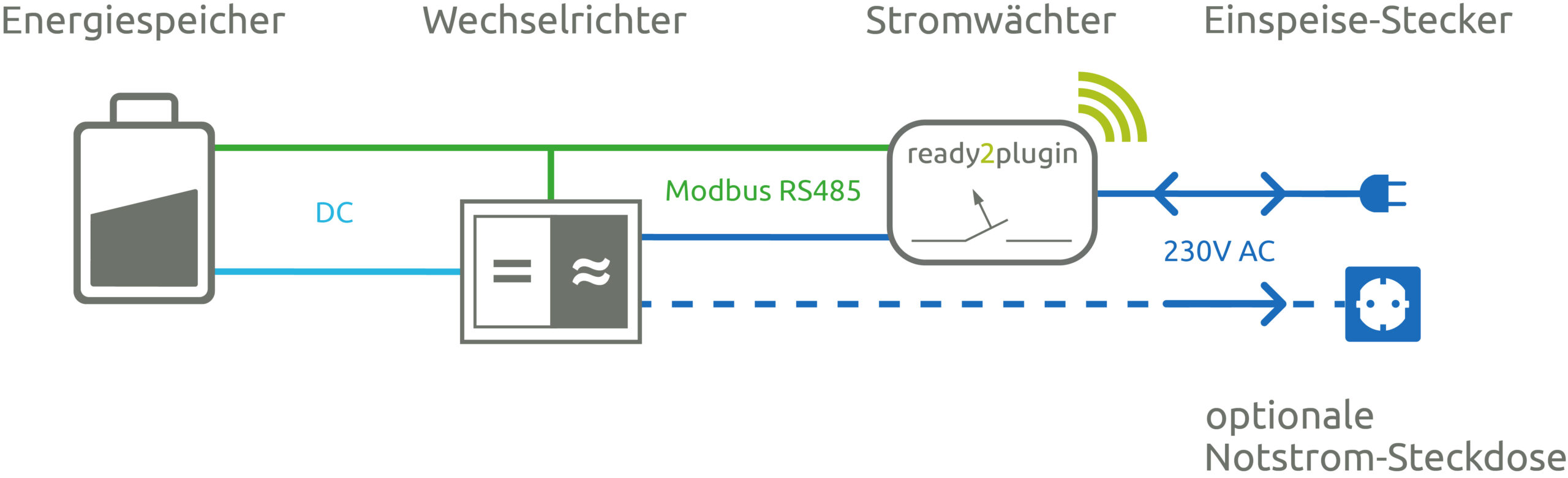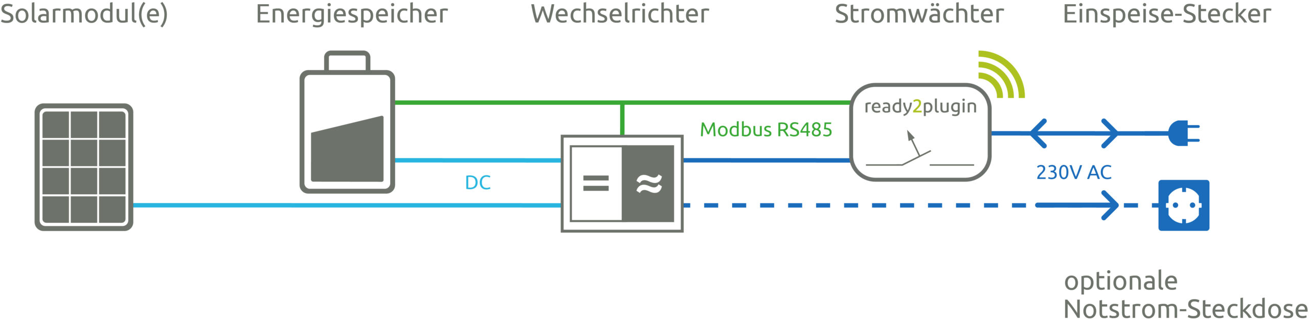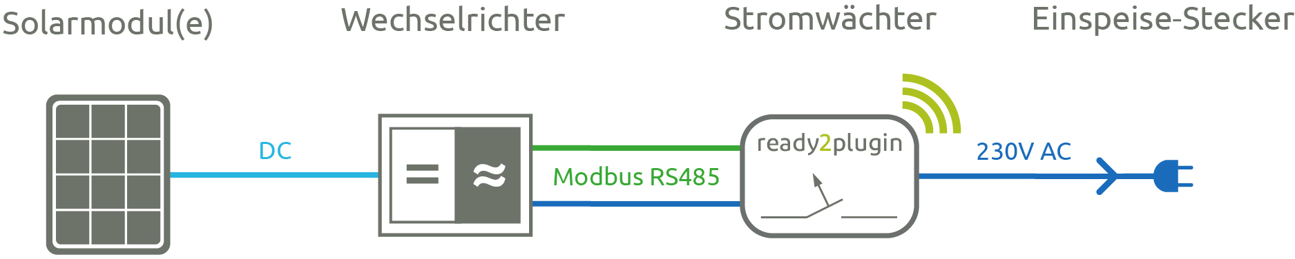 Kompatible Wechselrichter mit RS485-Schnittstelle, die mit dem Modbus-Protokoll arbeiten, werden per Ethernet-Schnittstelle mit dem Stromwächter verbunden. Der ready2plugin Stromwächter steuert dann den Wechselrichter elektronisch. Dies ist die bevorzugte Anschlussvariante.